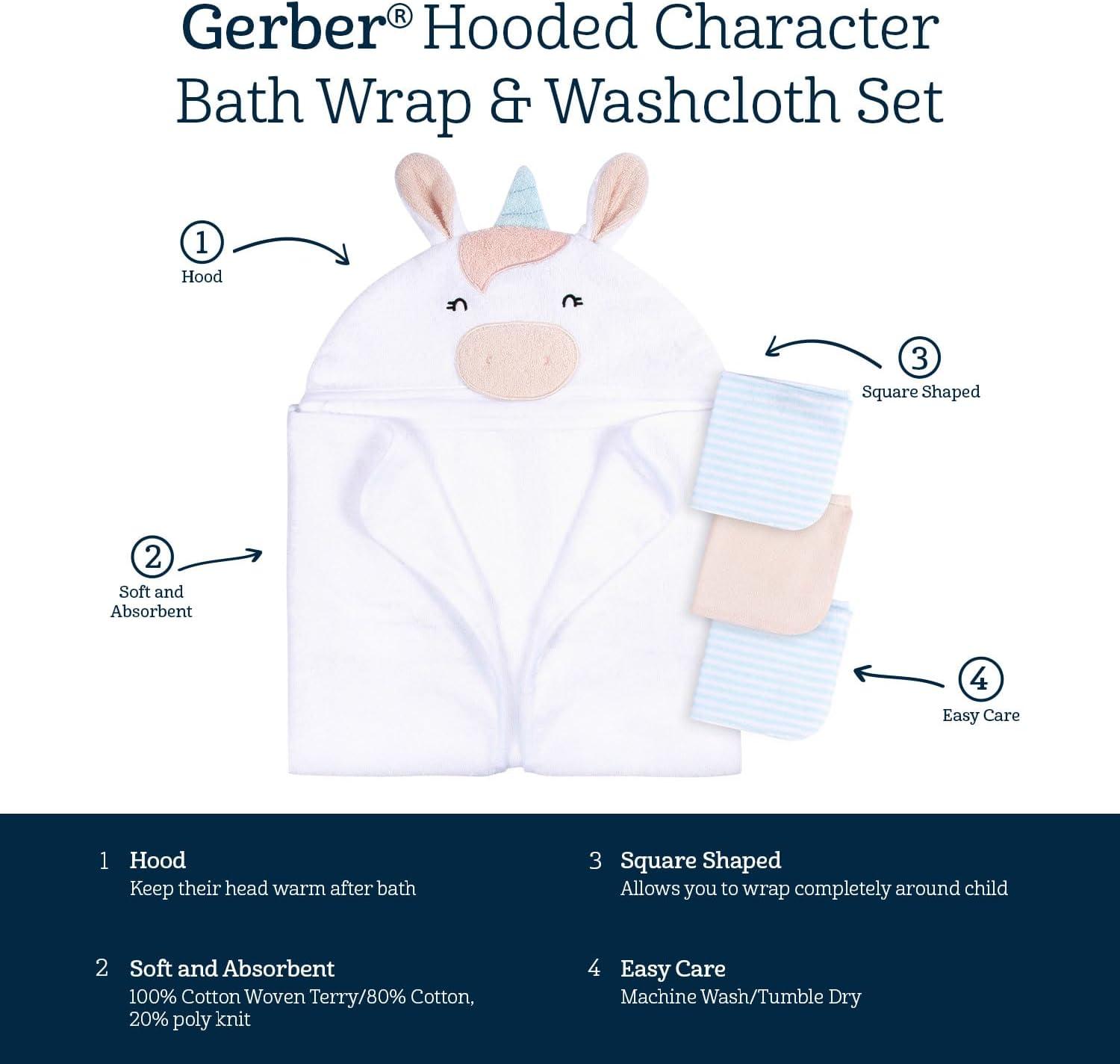 Gerber Baby 4 Piece Animal Character Hooded Towel and Washcloth Set, Grey Elephant, One Size(White Unicorn)
