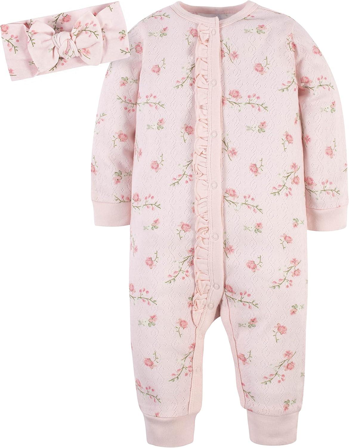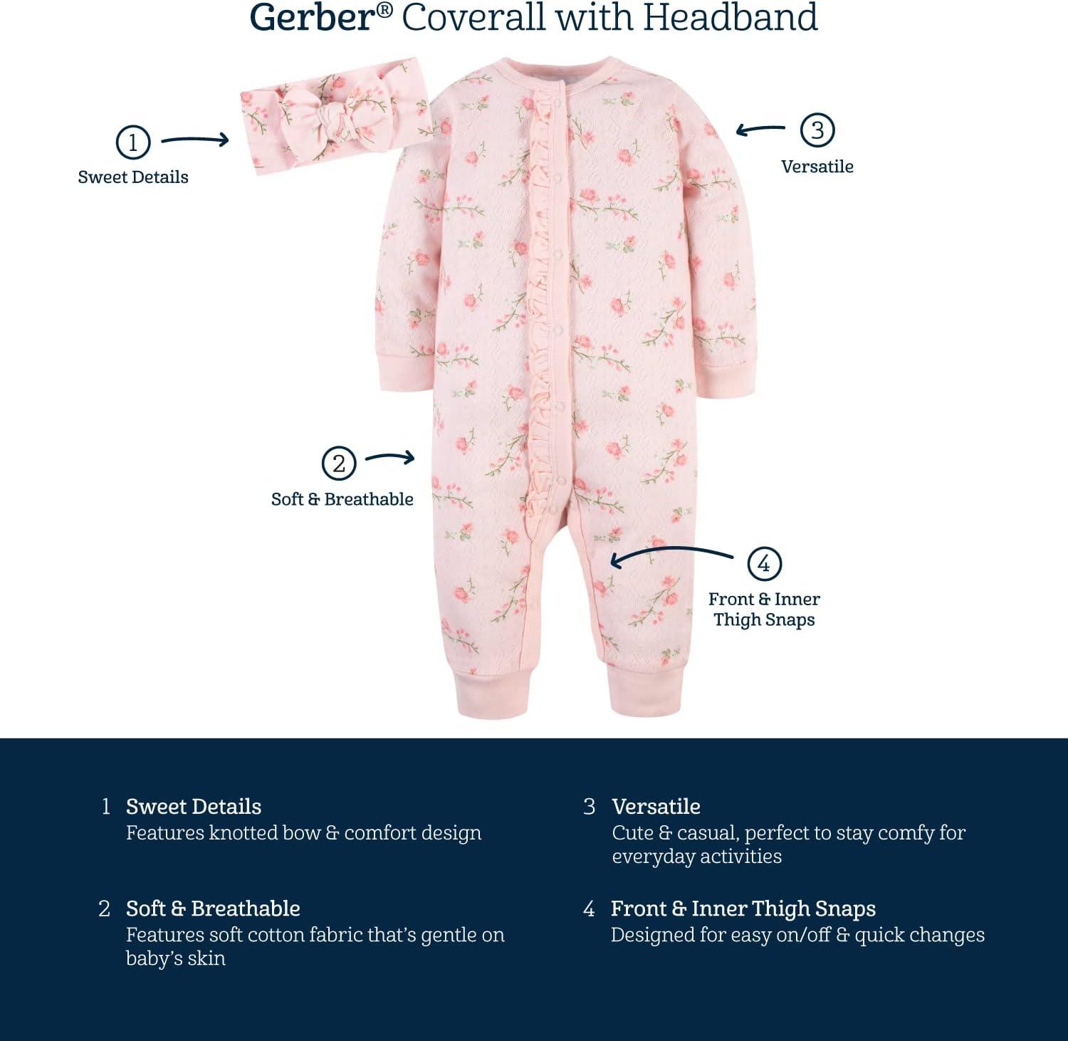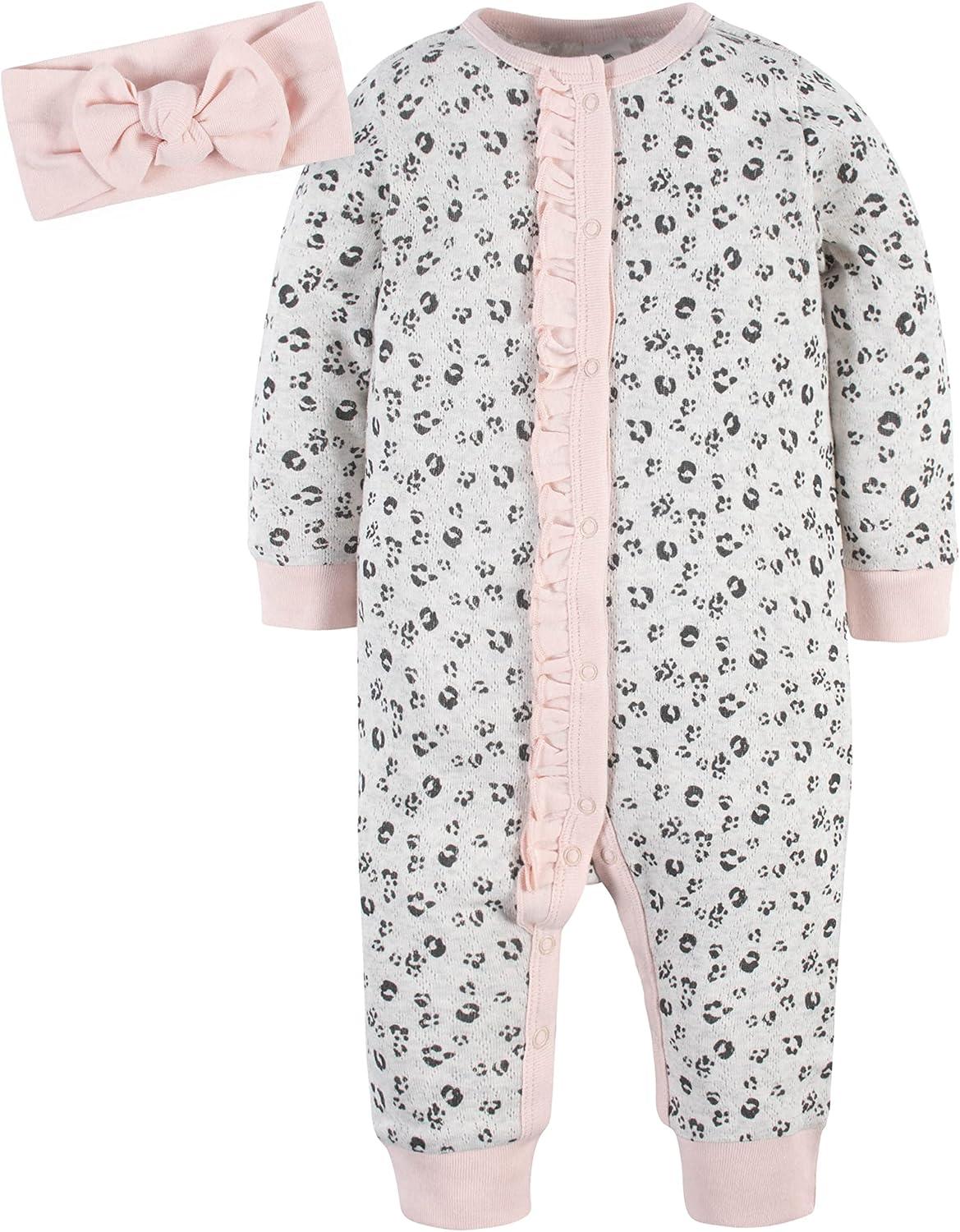 Gerber baby-girls 4-piece Coveralls & Headband Sets(Leopard & Floral)